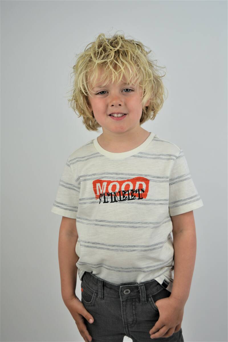 Noud draagt een t-shirt van Moodstreet, Moodstreet is een nieuw merk bij Hip-Kinderkleding en ik vind het echt een leuke aanvulling op de kleding die Tamar al verkoopt. Ook voor meisjes hebben ze leuke dingen. Noortje heeft een mooie jurk van Moodsteet aan, zie blog.