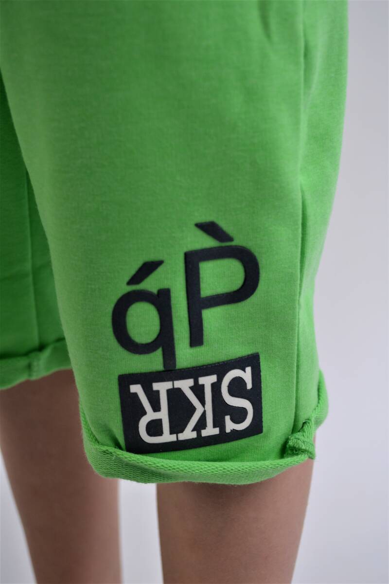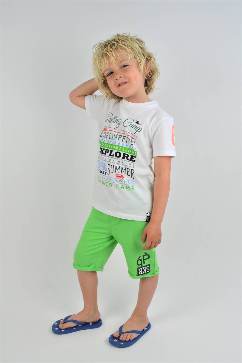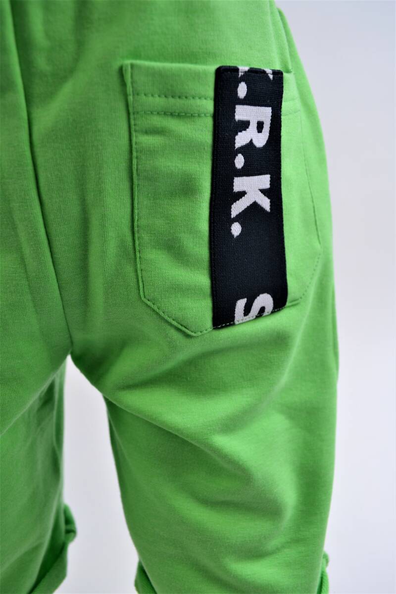 De hele set die Noud uitgekozen heeft is van het merk SKURK. De broek valt lekker op door het felle mintgroene kleurtje. Het is een Sweat short met een print onder op de pijp. Hij heeft twee zakken met rits voorop en een kontzak. Deze broek heeft een elastische tailleband, ideaal dus!