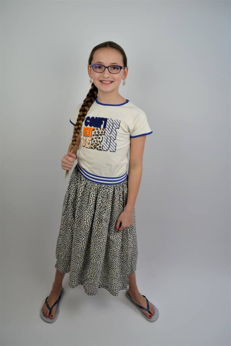 Noortje is nog altijd gek op de panter print, maar deze rok is net even anders. Er zitten prachtige, zomerse kleuren in verwerkt. Deze zie je ook terug in haar shirt, dus past echt goed op elkaar.